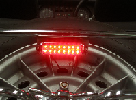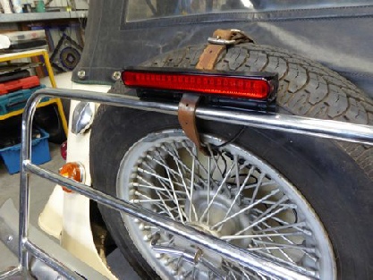 The standard brake lights on an older Morgan are quite low and not always that bright. I was also concerned that when racing my '69 Plus 8 the older style (Triumph Spitfire) stop lights were quite hard for those following (the preferred position!) to see. Here's one way of adding a third light at a higher level and with a high intensity red which cannot be missed... I purchased a a pair of LED lamps through eBay - On the '75 Plus 8 (pictured) I have used the luggage rack as a mounting point for the light. This is fine but it does mean that when carrying luggage the light is obscured. However, for the majority of the time it is an effective high intensity stop light. I would like to design an adjustable high level light using this as a basis so that even with luggage there would be an effective high level light. Please let me know if you are interested in this idea.  |