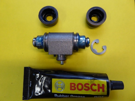 The solution in this case was to replace the cylinders (Part #CW 15953). They are available from dealers or on eBay. Before fitting the new cylinders I removed the rubber boots and liberally applied Bosch rubber grease which is meant for exactly this purpose. More was applied on the inside lip of each boot to help stop ingress of air to the cylinder. The GoMog website has a detailed article on removing/installing these cylinders.